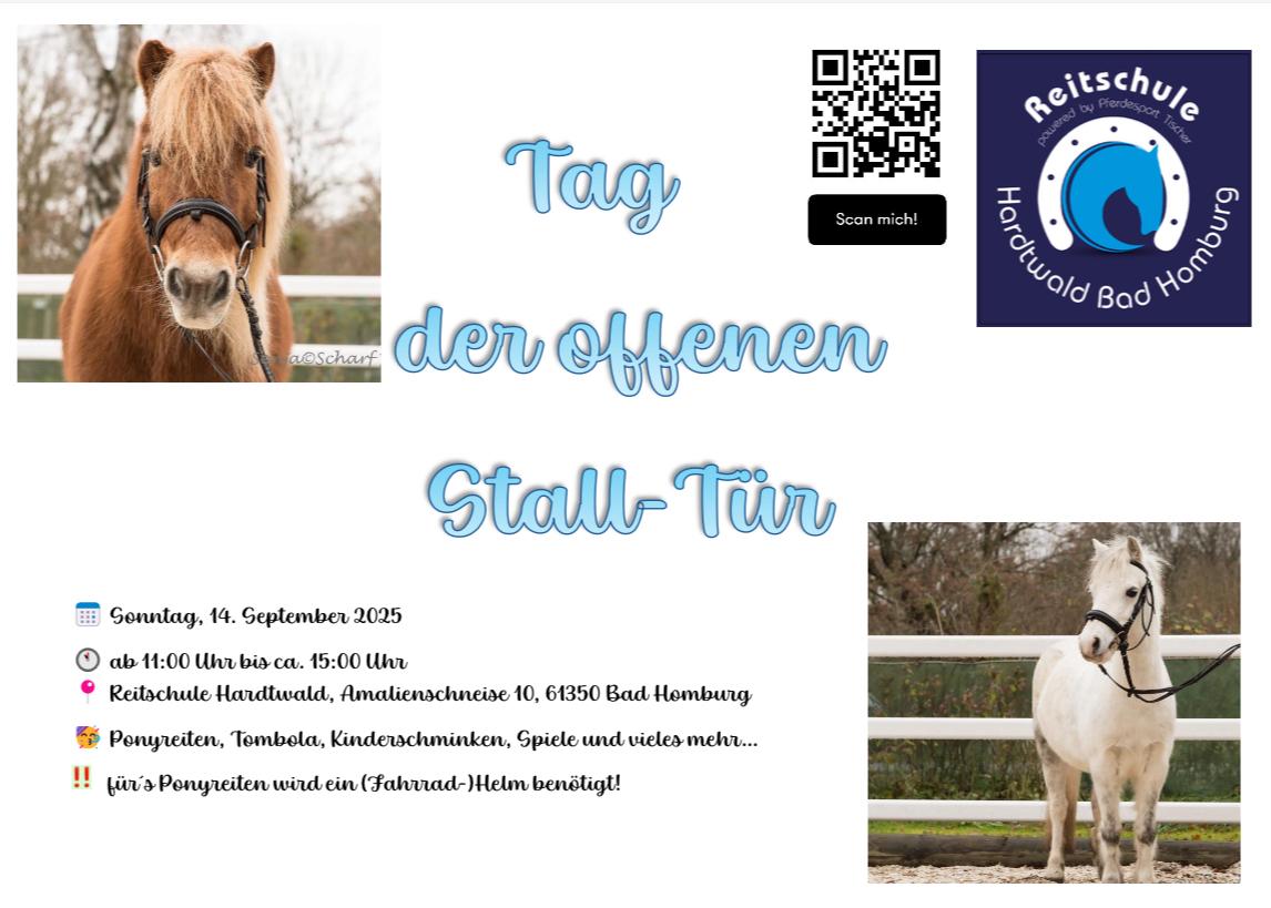 Kontakt: 0160/93134918 (Reitschule Hardtwald by Pferdesport Tischer) oder per E-Mail: info@reitschule-hardtwald.de